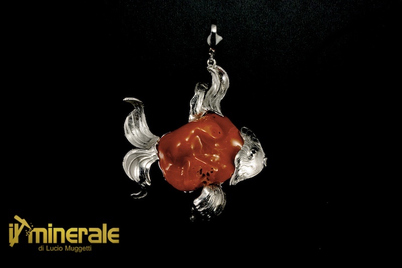 Ciondolo a forma di pesce con il corpo in corallo rosso-arancio grezzo
