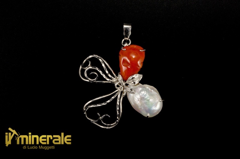 Ciondolo a motivo floreale con elemento di corallo rosso grezzo ed una perle coltivata d'acqua dolce scaramazza