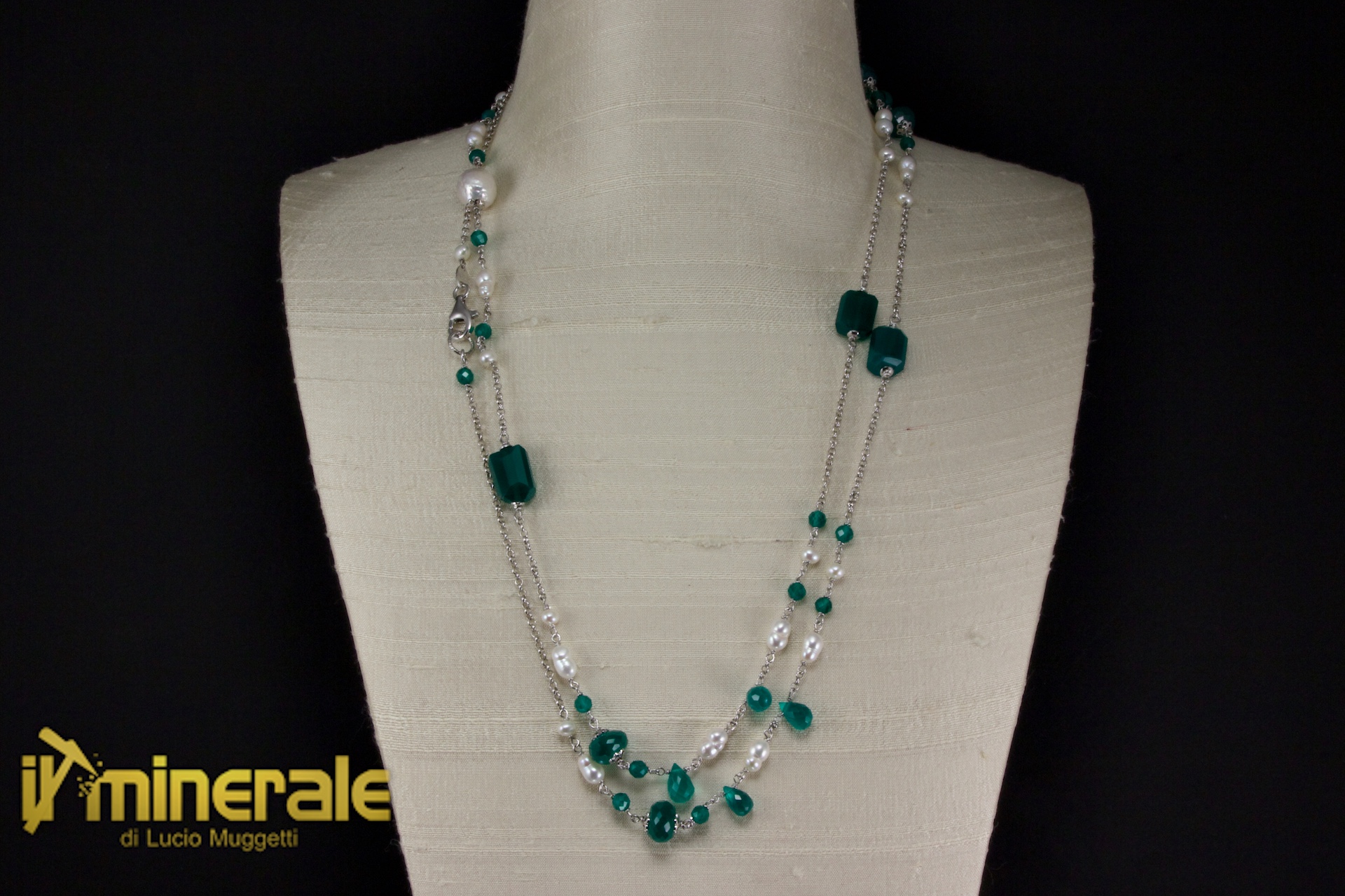 Catena in argento 925 rodiato con agata verde (elementi taglio laser da 10x13 mm, rondelle sfaccettate da 9,5 mm, sfere sfaccettate da 4 mm, gocce sfaccettate da 5,5x9 mm) e perle coltivate d'acqua dolce di forma irregolare (le più piccole da 3,5 mm, la centrale da 10 mm e quelle più allungate da 5x8 mm)