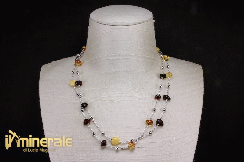 Catena in argento 925 rodiato con elementi irregolari di ambra naturale di diversi colori della dimensione di circa 9-13 mm