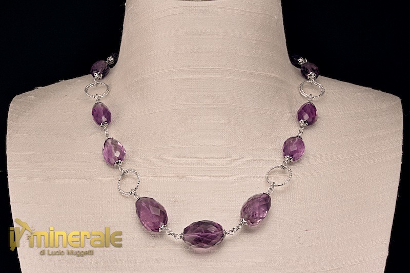 Catena in argento 925 rodiato con ovali sfaccettati di ametista (il più grande misura 19x13 mm)