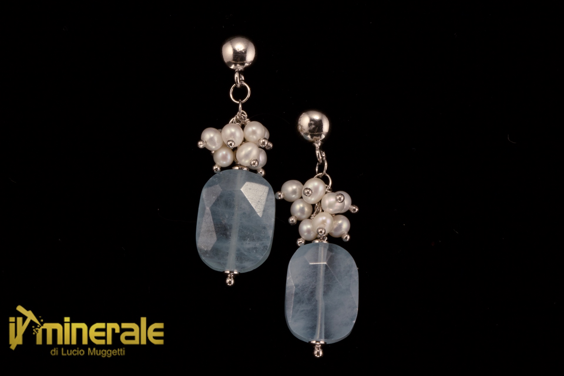 Orecchini pendenti in argento 925 rodiato con lenti piatte sfaccettate di acquamarina lattea (circa 13x18 mm) e perle coltivate d'acqua dolce di forma irregolare del diametro di circa 4,5 mm