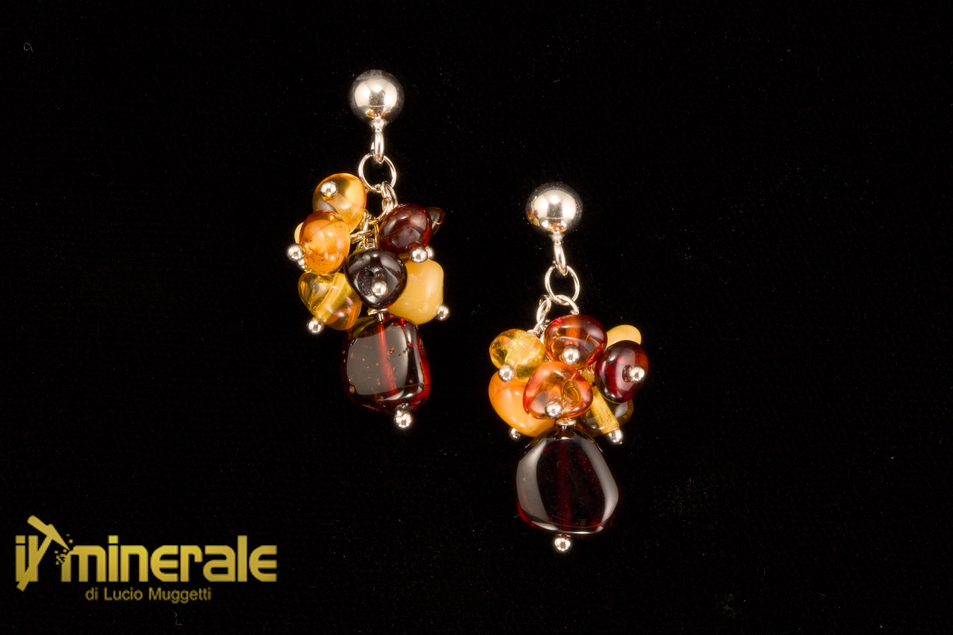 Orecchini pendenti a pressione in argento 925 rodiato con ciuffo di ambre naturali varicolori, le più grandi misurano circa 8,5x8,5 mm