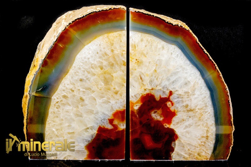 Nodulo di agata-corniola e quarzo tagliato e lucidato in due parti a reggilibri