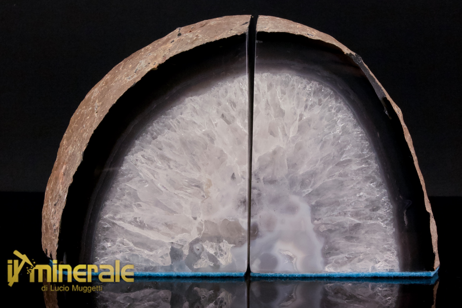 Nodulo di agata e quarzo ialino compatto tagliato e lucidato in due parti a reggilibri