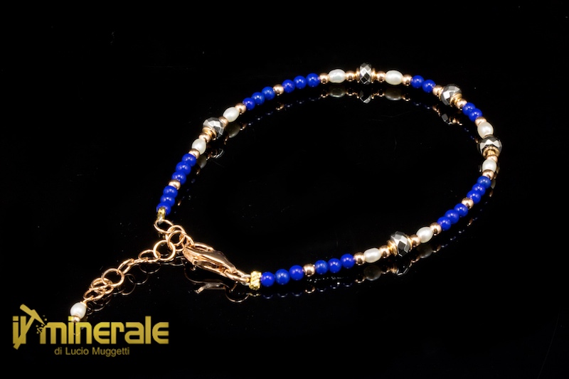 Bracelet composed of lapis lazuli spheres (2.5 mm diameter), faceted hematite washers (4 mm diameter) and small oval-shaped freshwater cultured pearls