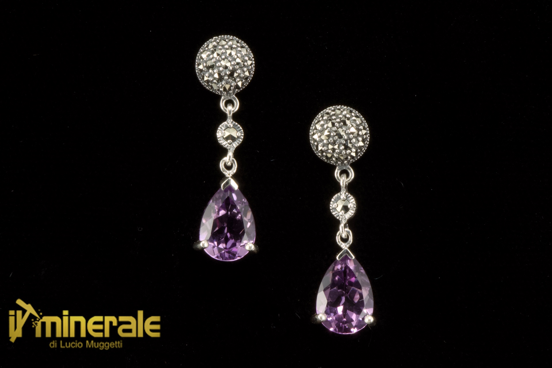 Orecchini a pressione pendenti in argento 925 con gocce di ametista e marcassiti