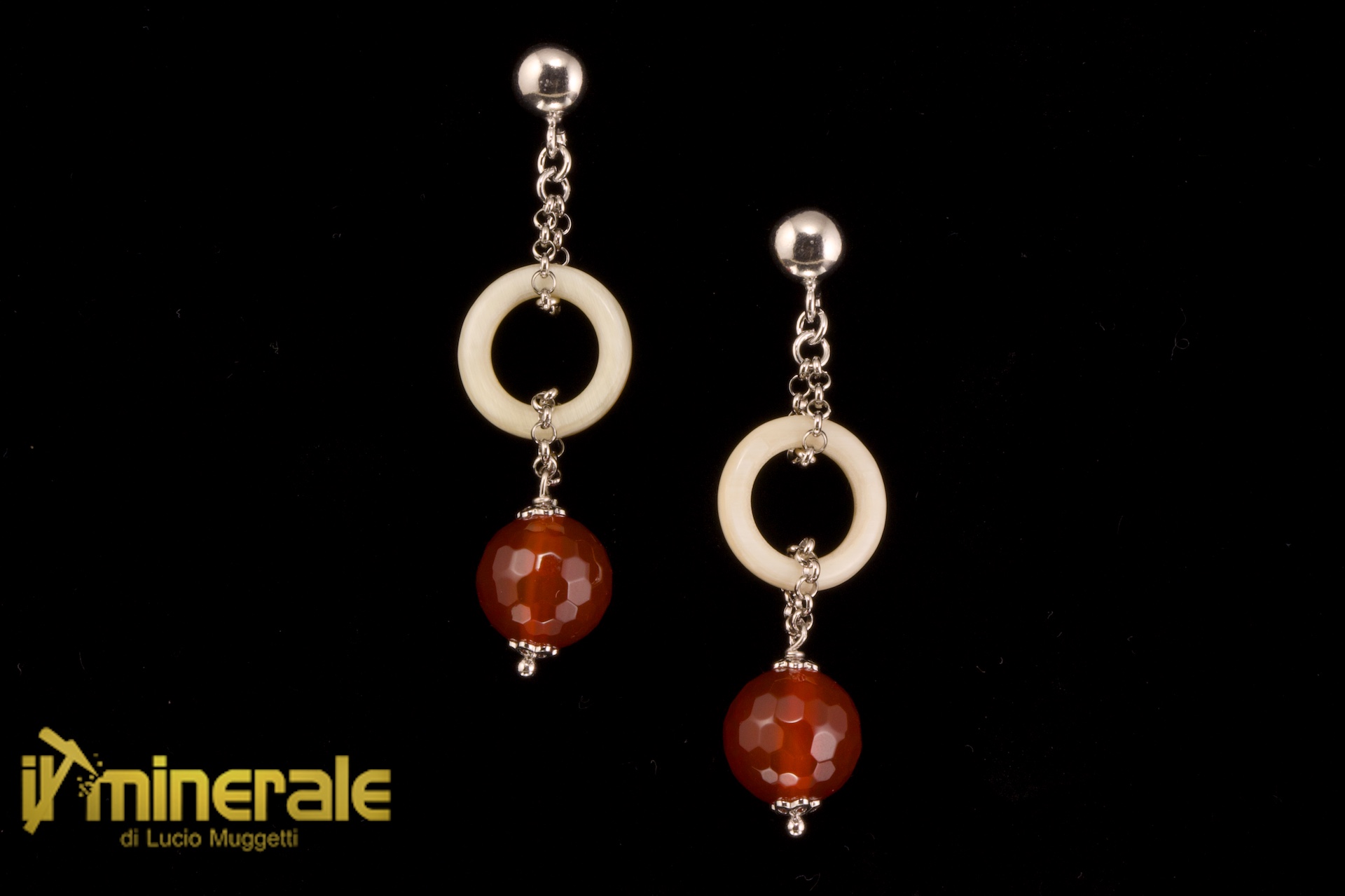 Pendant earrings in rhodium-plated 925 silver with buffalo horn and faceted carnelian spheres with a diameter of 12 mm