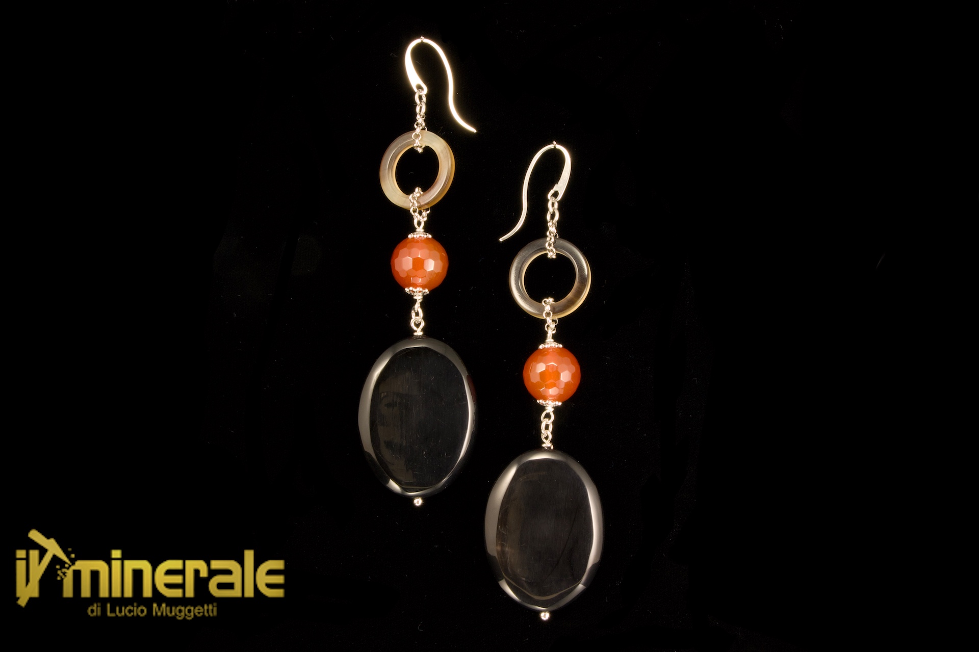 925 rhodium-plated silver pendant hook earrings with two-tone buffalo horn and faceted carnelian spheres with a diameter of 14 mm