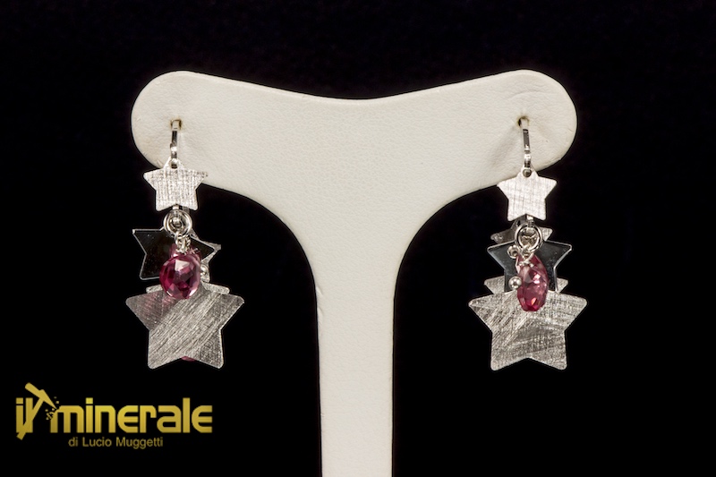 925 rhodium-plated silver hoop earrings with silver stars and faceted drops of garnet "rhodolite" variety (6x7 mm)