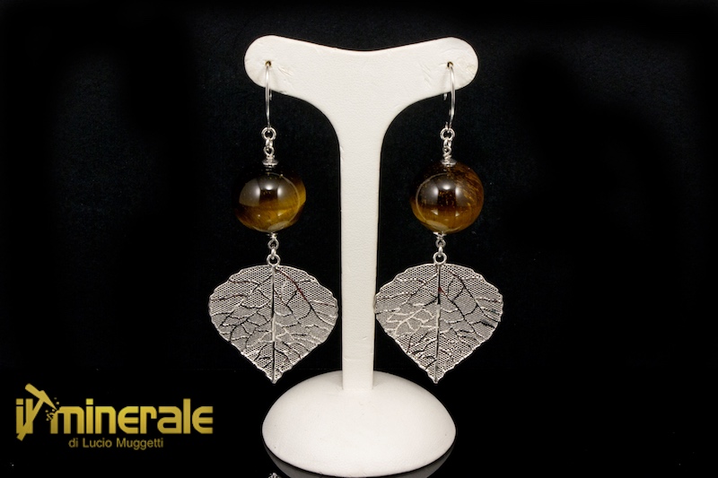 Pendant hook earrings in 925 rhodium silver with tiger eye spheres (diameter 18 mm) and leaves in silver filigree