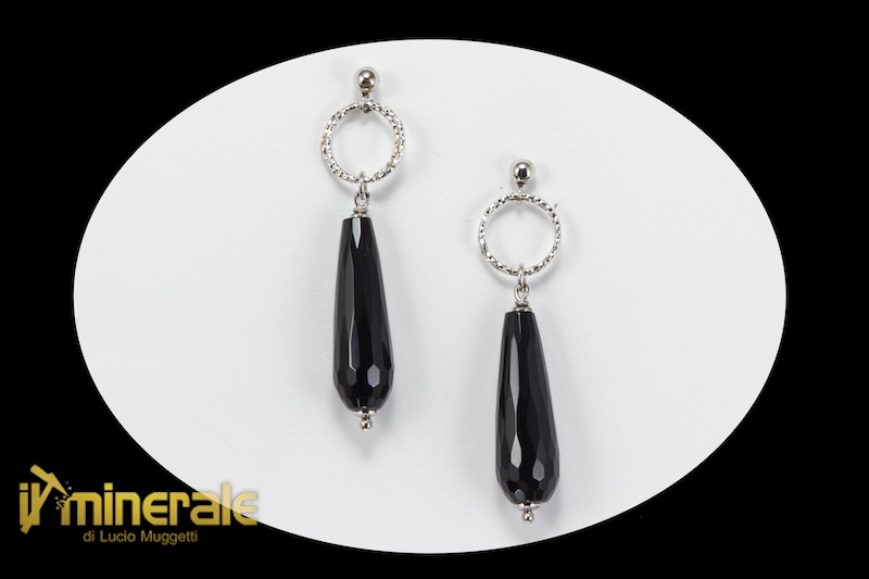 Pendant earrings in rhodium-plated 925 silver with elongated and faceted onyx balls measuring 10x30 mm