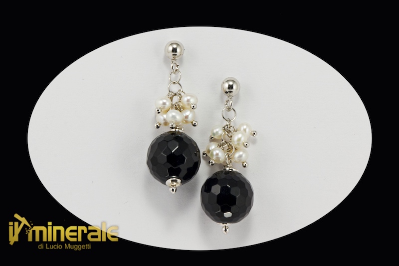 Dangle earrings in rhodium-plated 925 silver with faceted onyx spheres with a diameter of 12 mm and a tuft of white freshwater cultured pearls with a diameter of about 4 mm