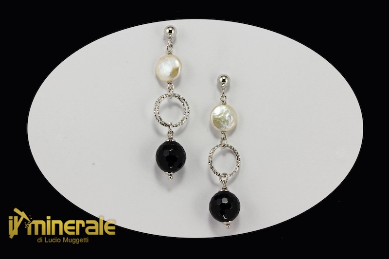Dangle earrings in rhodium-plated 925 silver with faceted onyx spheres with a diameter of 12 mm and "coin" freshwater cultured pearls (diameter 11 mm)