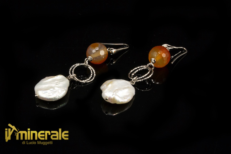 Dangle hook earrings in 925 rhodium-plated silver with faceted carnelian spheres (diameter 12 mm) and "coin" freshwater cultured pearls measuring 16.5x19.5 mm
