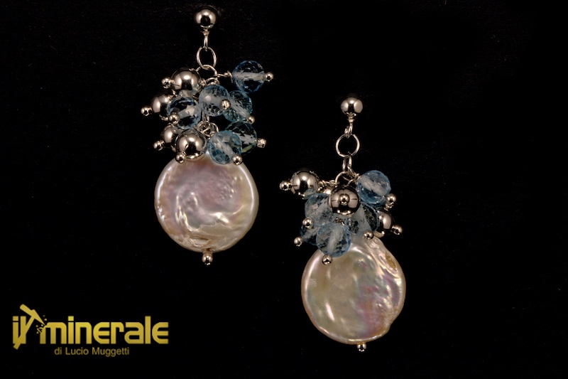 Dangle earrings in 925 rhodium-plated silver with "coin" freshwater cultured pearls (diameter 16 mm) and faceted blue topaz beads with a diameter of 5 mm