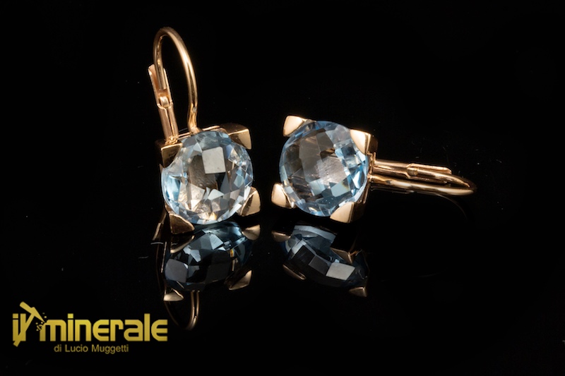 Hook earrings in 925 silver rose gold plated with a round faceted briolette of blue topaz with a diameter of 10 mm