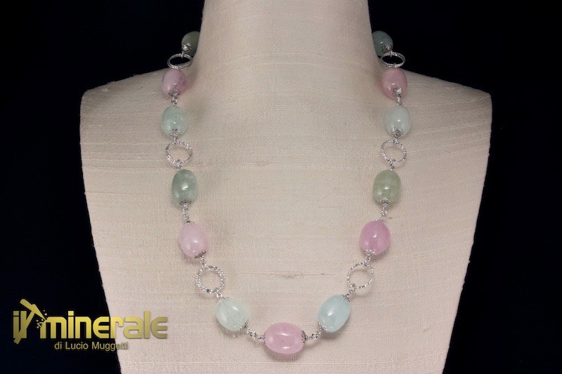 Chain in rhodium-plated 925 silver with irregular ovals of milky aquamarine and morganite (pink beryl). The central element measures 13x18 mm