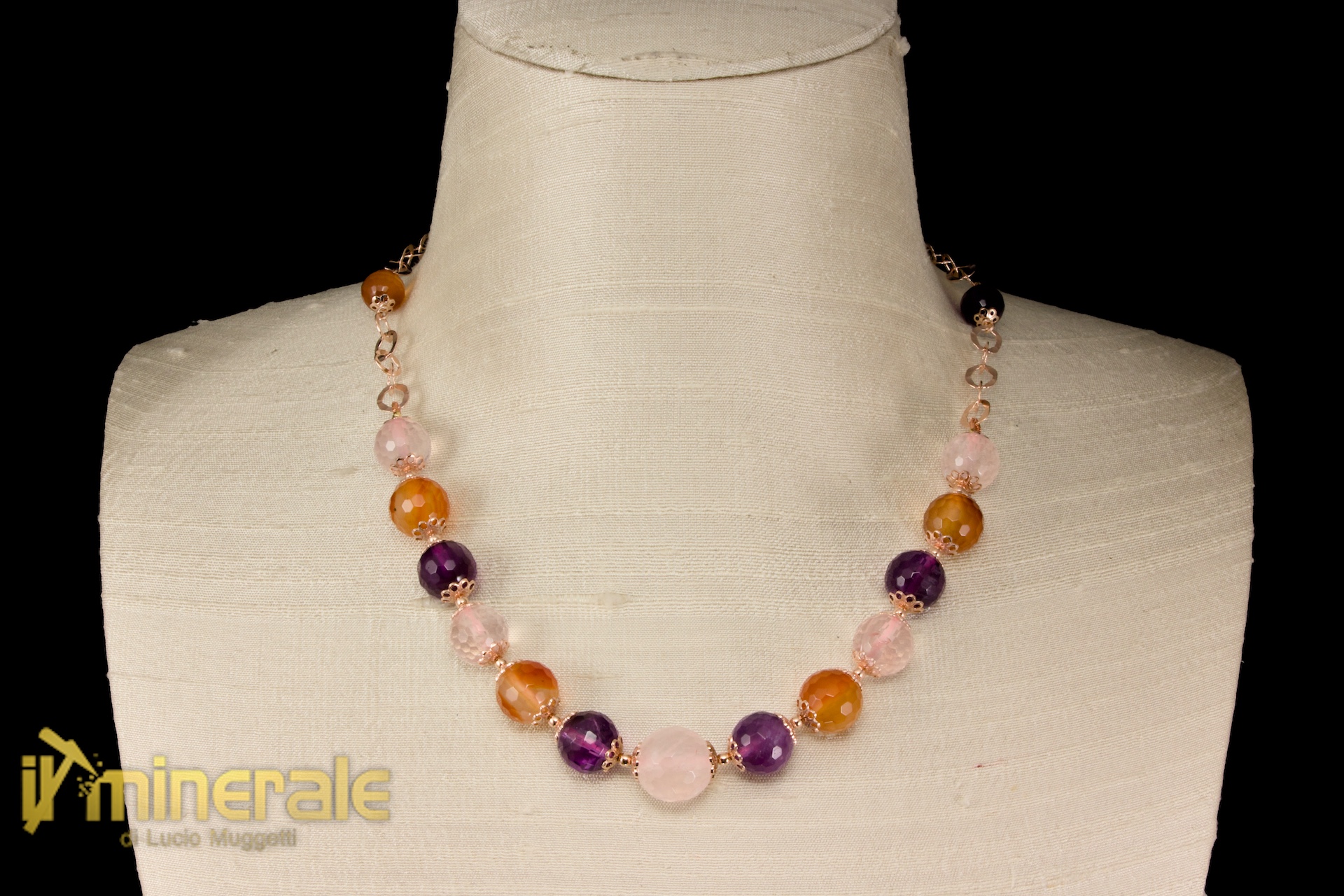 Rose gold plated 925 silver chain with faceted spheres of amethyst (diameter 8 and 10 mm), carnelian (8 and 10 mm) and rose quartz (10 and 12 mm)