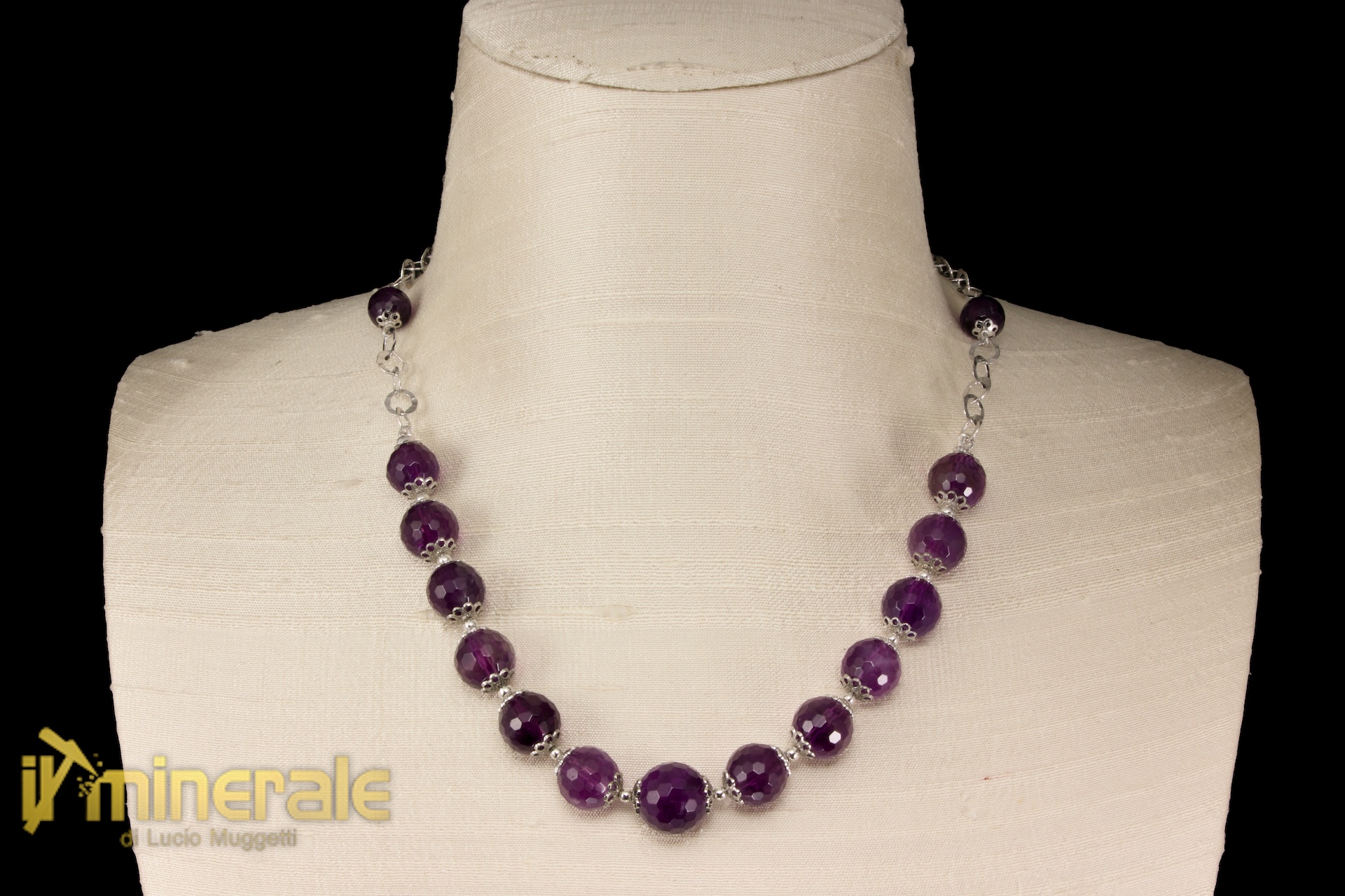 Chain in rhodium-plated 925 silver with faceted amethyst spheres with a diameter of 8, 10 and 12 mm
