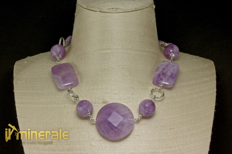 Chain in rhodium-plated 925 silver with elements of various shapes and sizes of lavender amethyst. The central faceted disc has a diameter of 35.5 mm while the faceted spheres have a diameter of 14 mm.