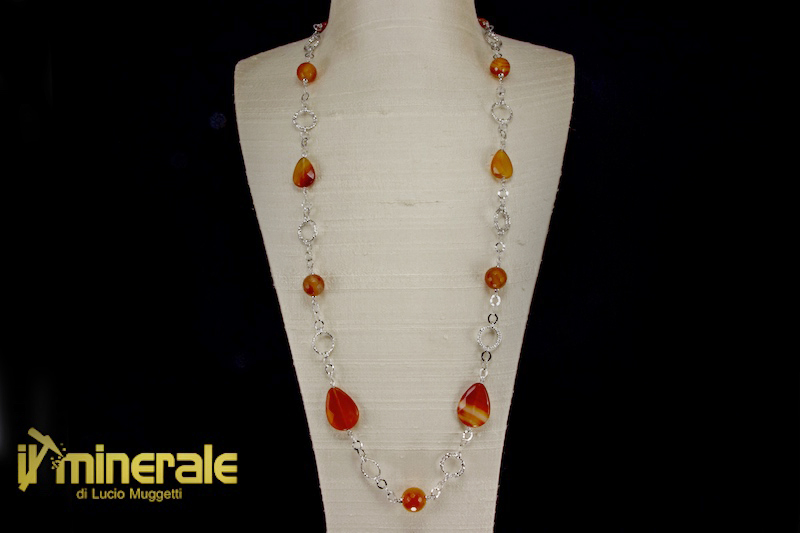Rhodium-plated 925 silver chain with faceted drops and faceted balls (12 mm diameter) of natural carnelian