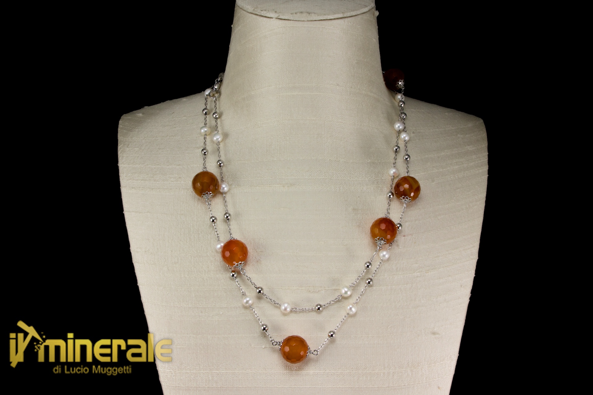 Chain in rhodium-plated 925 silver with faceted carnelian spheres (diameter 14 mm) and white freshwater cultured pearls with a diameter of approximately 5.5 mm