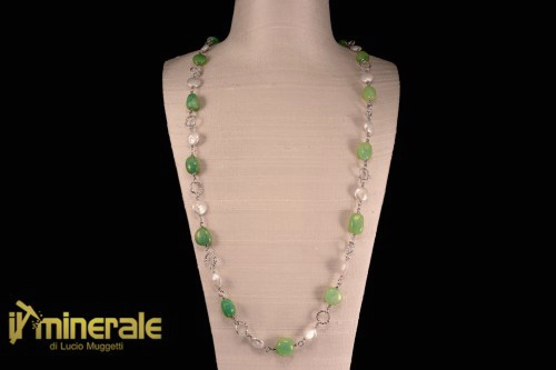 Chain in rhodium-plated 925 silver with tumbled chrysoprase elements (the central one measures 11x13.5 mm) and "Coin" freshwater cultured pearls (diameter 11 mm)