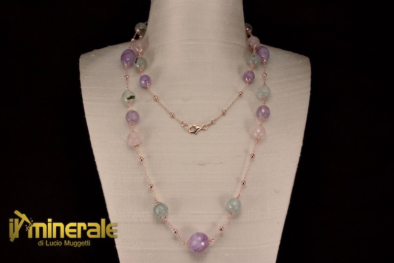 Ca022Ns6235 Catena in argento con ametista lavanda, prehnite e quarzo rosa