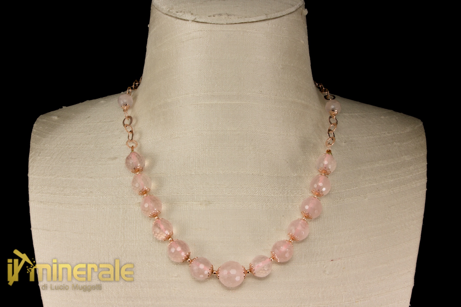 Rose gold plated 925 silver chain with faceted rose quartz spheres with a diameter of 8, 10 and 12 mm