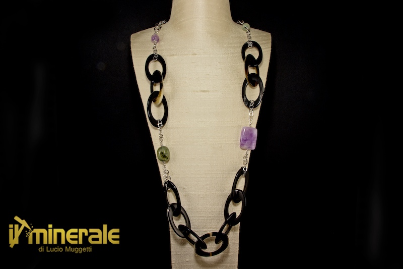 Black buffalo horn chain with a faceted sphere (diameter 12 mm) and a barrel (17x20 mm) of prehnite, a faceted sphere (12 mm) and a rectangular element (22x30 mm) of lavender amethyst