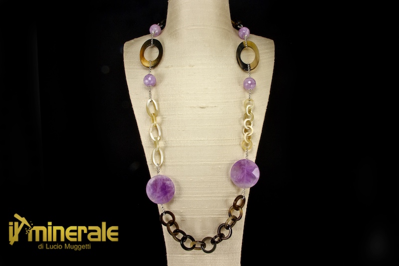 Two-tone buffalo horn chain with faceted spheres (16 mm diameter) and faceted lenses (25.5 mm diameter) of lavender amethyst