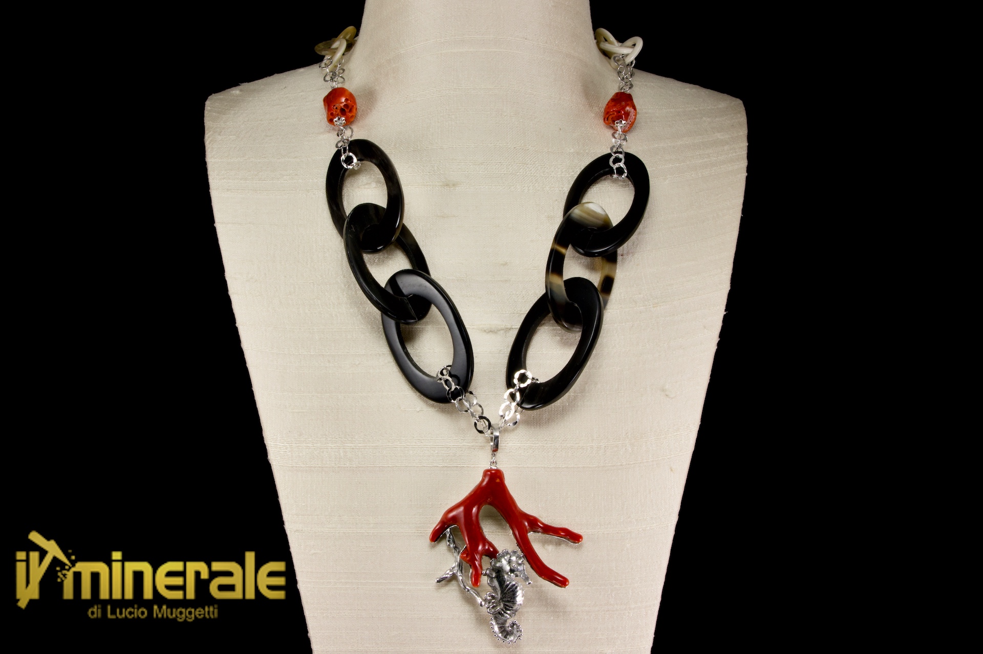 Two-tone buffalo horn chain with a 7.5 cm long red coral branch pendant and two 13.5x14.5 mm raw red coral elements