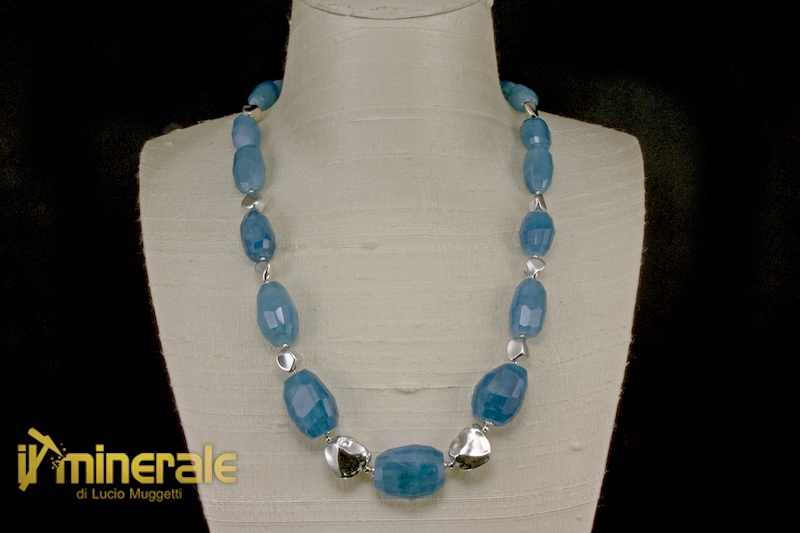 Necklace composed of faceted barrels of milky aquamarine of very intense color (size from 10x14 to 17.5x24 mm)