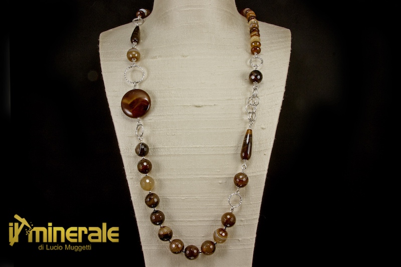 Necklace without clasp composed of faceted washers (diameter 10.5 mm), faceted sphere (14 mm) and other elements of various shapes and sizes of veined agate