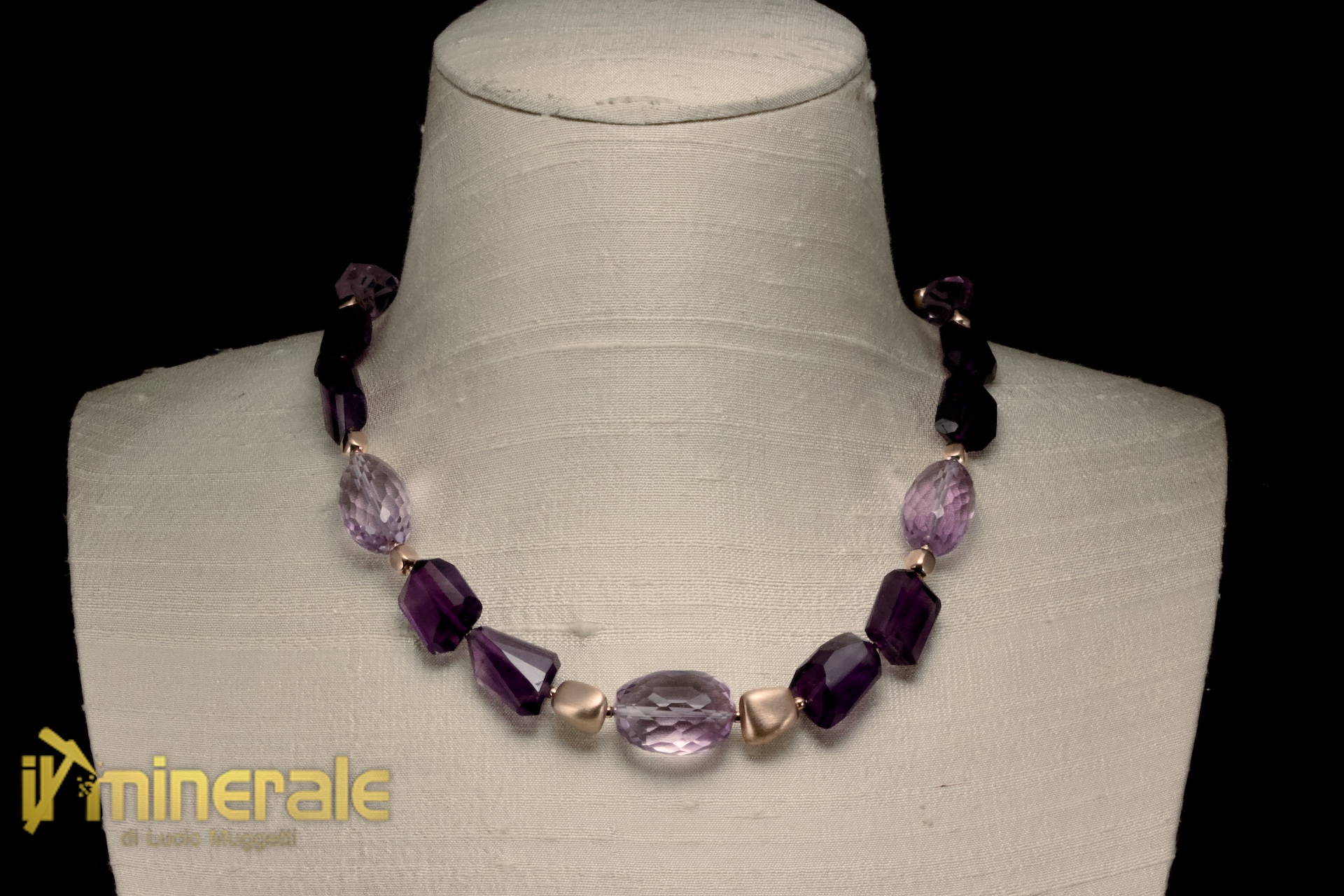 Collana composta da elementi irregolari di ametista taglio laser di colore viola scuro ed ovali sfaccettati più chiari (centro 14x19 mm)
