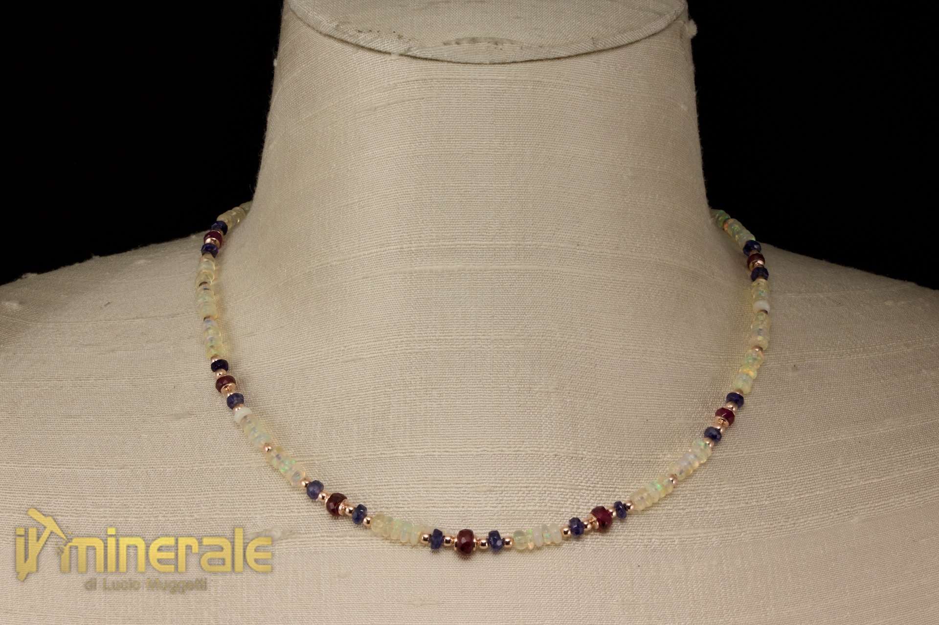 Necklace composed of noble opal rondelles (diameter from 3 to 3.8 mm), faceted sapphire rondelles (diameter 3.5 mm) and faceted ruby rondelles (from 3.5 to 4.5 mm)