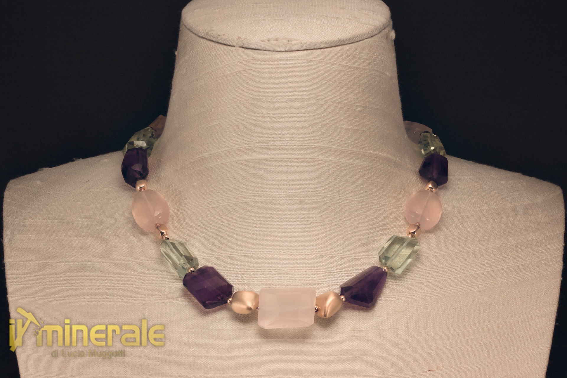 Collana composta da elementi di varie forme e dimensioni di quarzo rosa, quarzo citrino lemon e quarzo ametista (centro 13,5x20 mm)