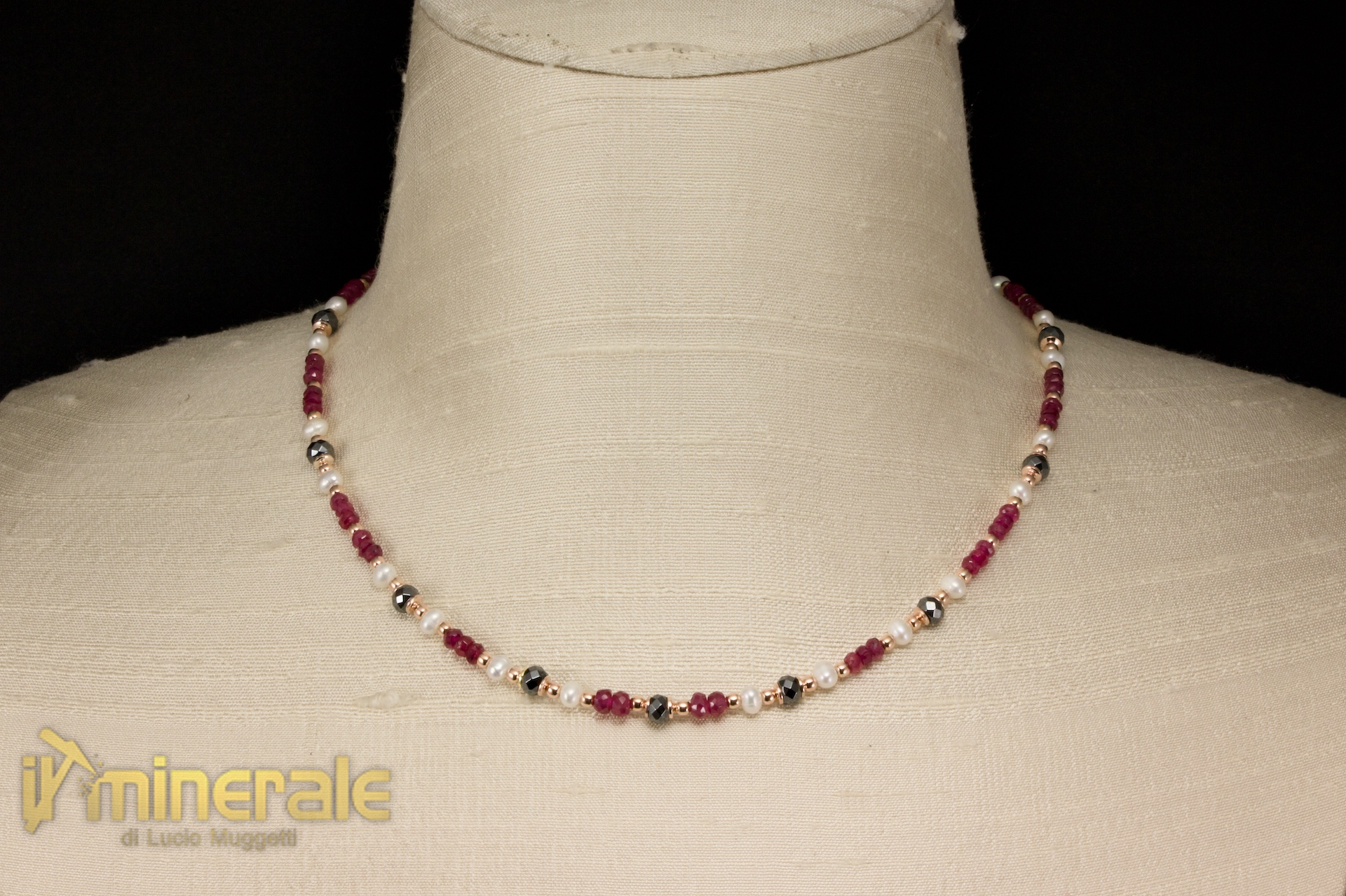 Necklace composed of faceted ruby rondelles (diameter 3-3.5 mm), faceted hematite rondelles (diameter 4 mm) and small irregularly shaped freshwater cultured pearls