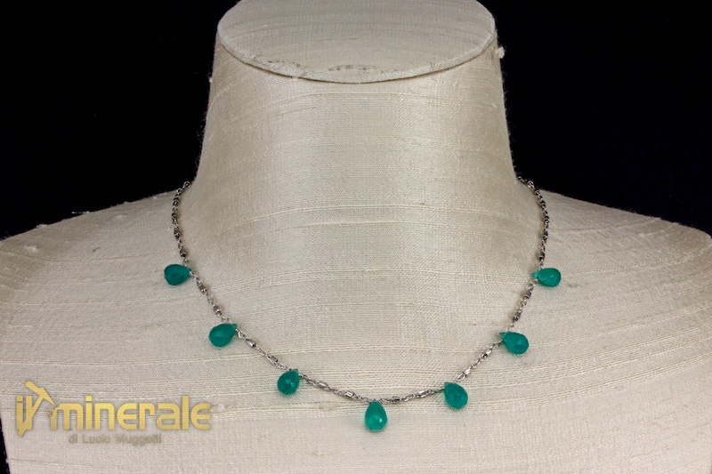 Necklace in 925 rhodium-plated silver with 7 faceted green agate briolettes of the size of 6x9 mm