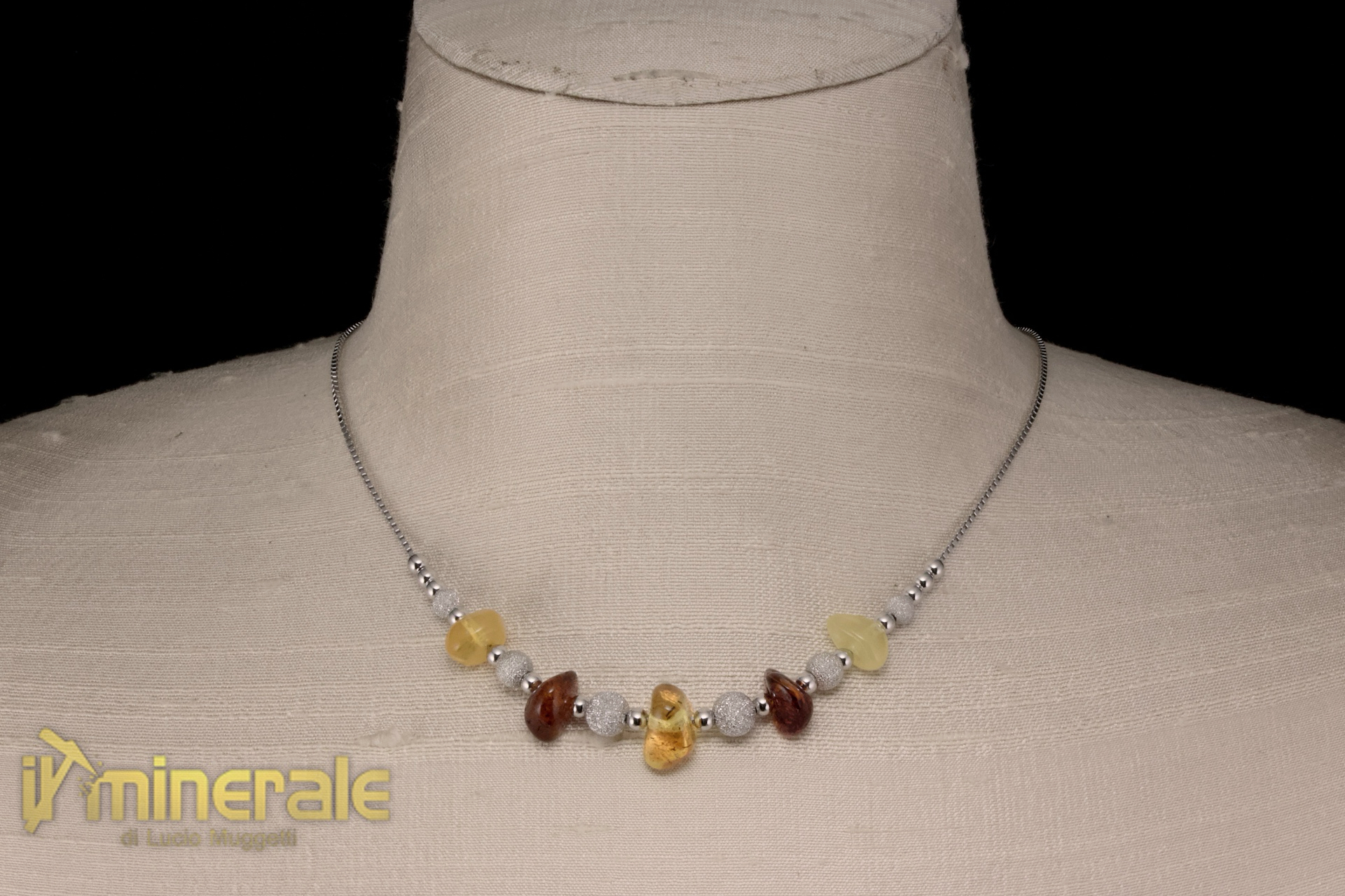 Necklace in rhodium-plated 925 silver with irregularly shaped elements of natural amber (the center has a diameter of about 11.5 mm)