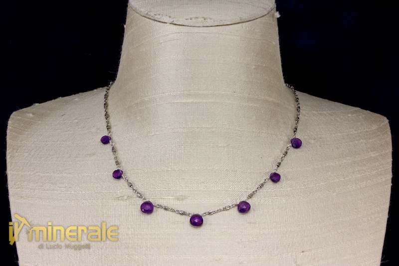 Necklace in rhodium-plated 925 silver with 7 flattened faceted drops of amethyst (8,5x9 mm)
