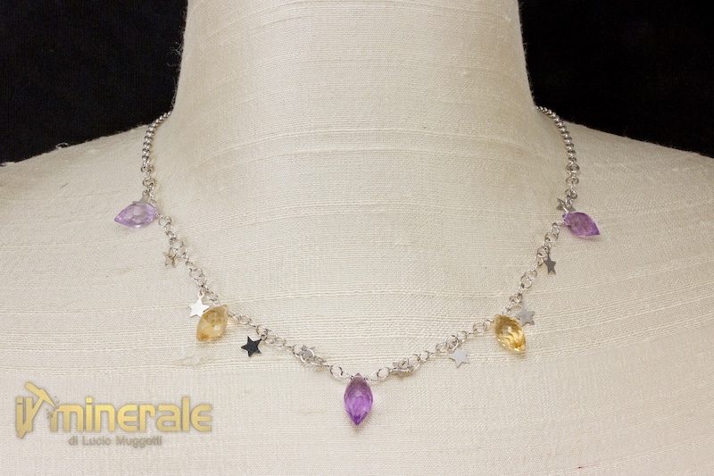Choker in rhodium-plated 925 silver with faceted navettes of citrine quartz and amethyst measuring from 5.5x10 to 7x13 mm