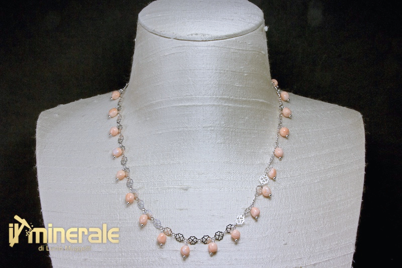 Necklace in rhodium-plated 925 silver with irregularly shaped elements of pink coral with a diameter of about 5-6 mm