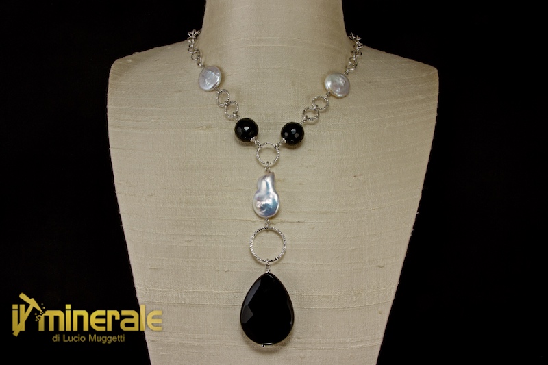 Choker composed of a 46 cm long 925 rhodium-plated silver chain, a faceted drop of onyx (30x40 mm), two faceted onyx spheres (14 mm) and three white freshwater cultured pearls