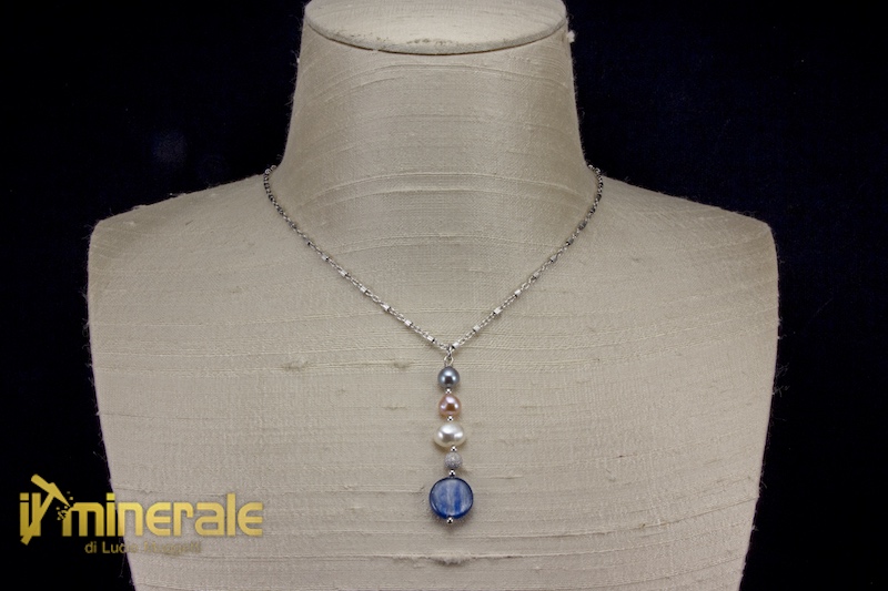 Choker composed of a rhodium-plated 925 silver chain with an adjustable length from 40 to 45 cm and a pendant with three freshwater cultured pearls of different colors and a round lens of kyanite with a diameter of 14 mm