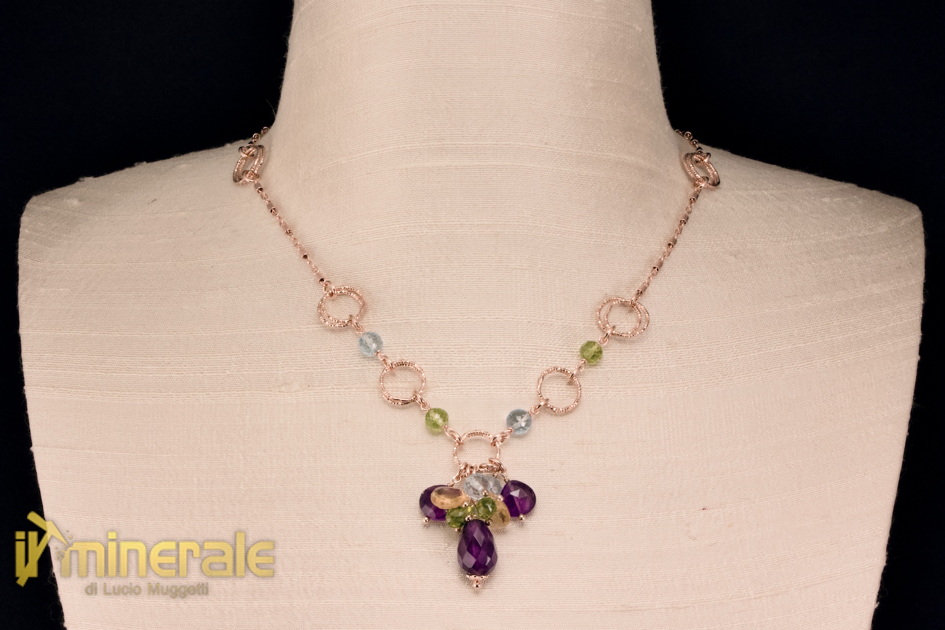 Girocollo composto da catena in argento 925 placcato oro rosa della lunghezza regolabile da 42 a 45,5 cm con ametista, citrino, topazio azzurro e peridoto di varie forme
