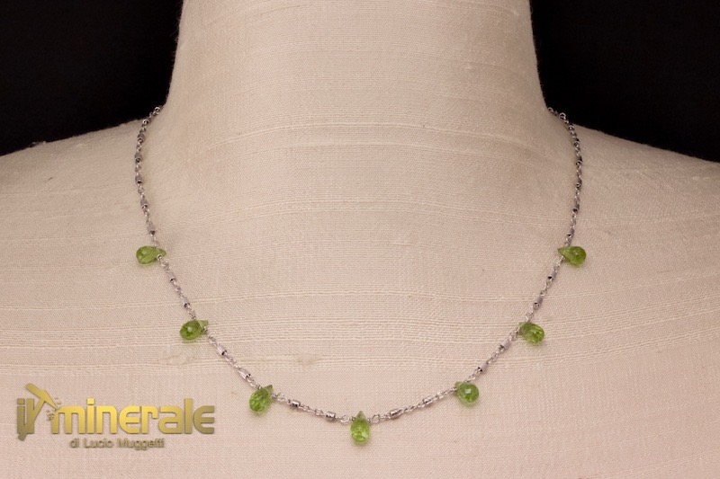 Necklace in rhodium-plated 925 silver with 7 faceted drops of peridot or olivine (4x7 mm)