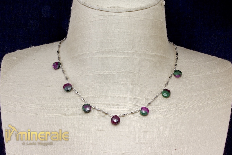 Necklace in rhodium-plated 925 silver with 7 faceted drops of ruby zoisite (green zoisite with ruby spots) measuring 7.5x7.5 mm