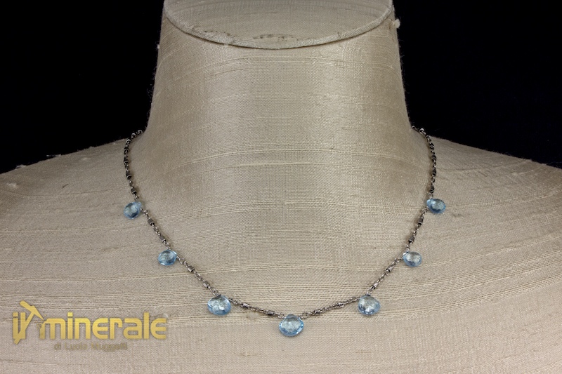 Necklace in 925 rhodium-plated silver with 7 flat faceted drops of blue topaz (7x7 mm)